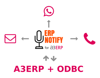 ERP NOTIFY es un servicio cloud, que se conecta de forma segura a tu a3ERP, u otros orígenes de datos ODBC de tu servidor, para gestionar el envío de plantillas de mensajes personalizables y combinándolas con éstos.